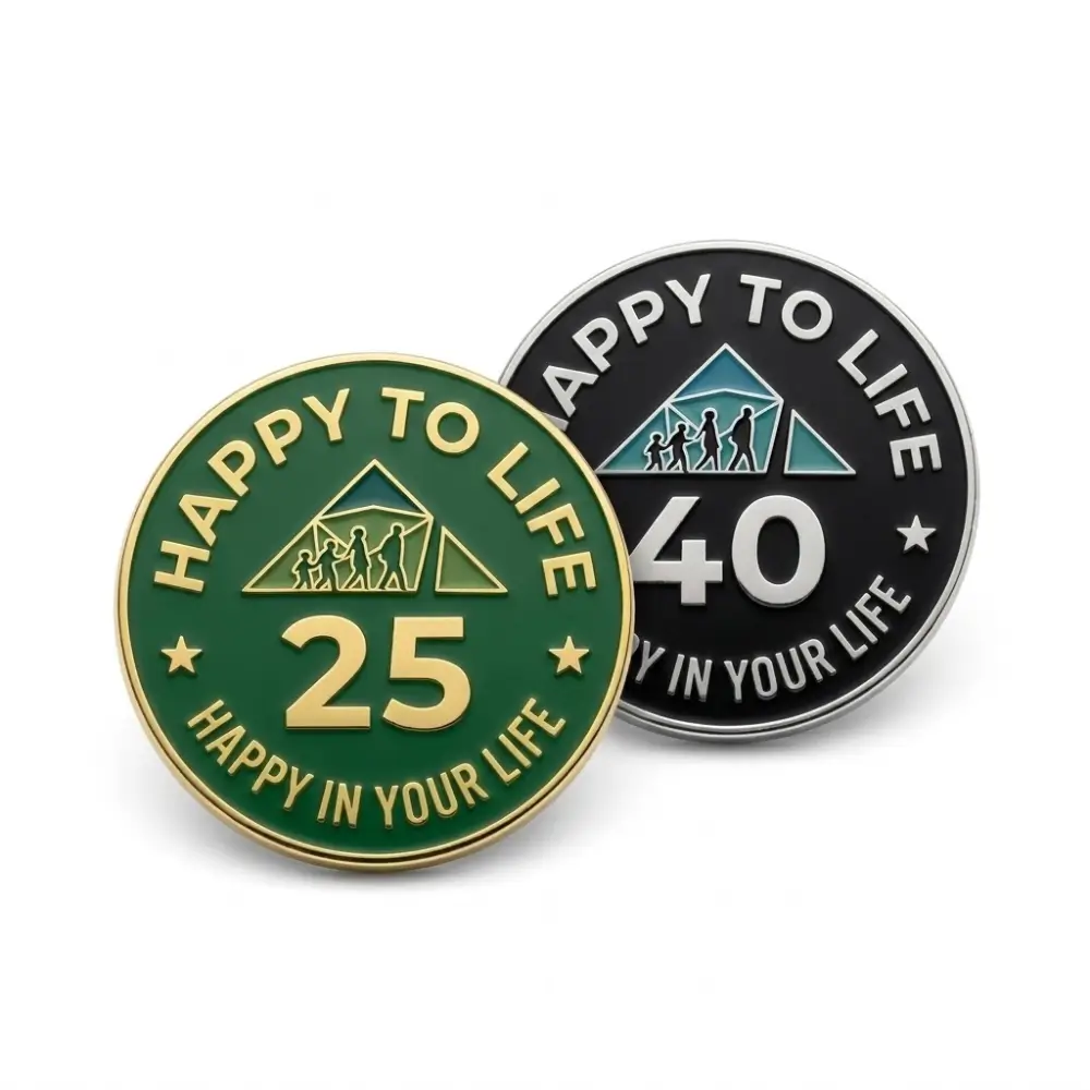 A custom die struck lapel pin made from iron, measuring 1.75" (4.4cm). Produced in Bangladesh with shipping and tariffs included to USA. Perfect for corporate events, recognition awards, promotional giveaways, and commemorative collections.