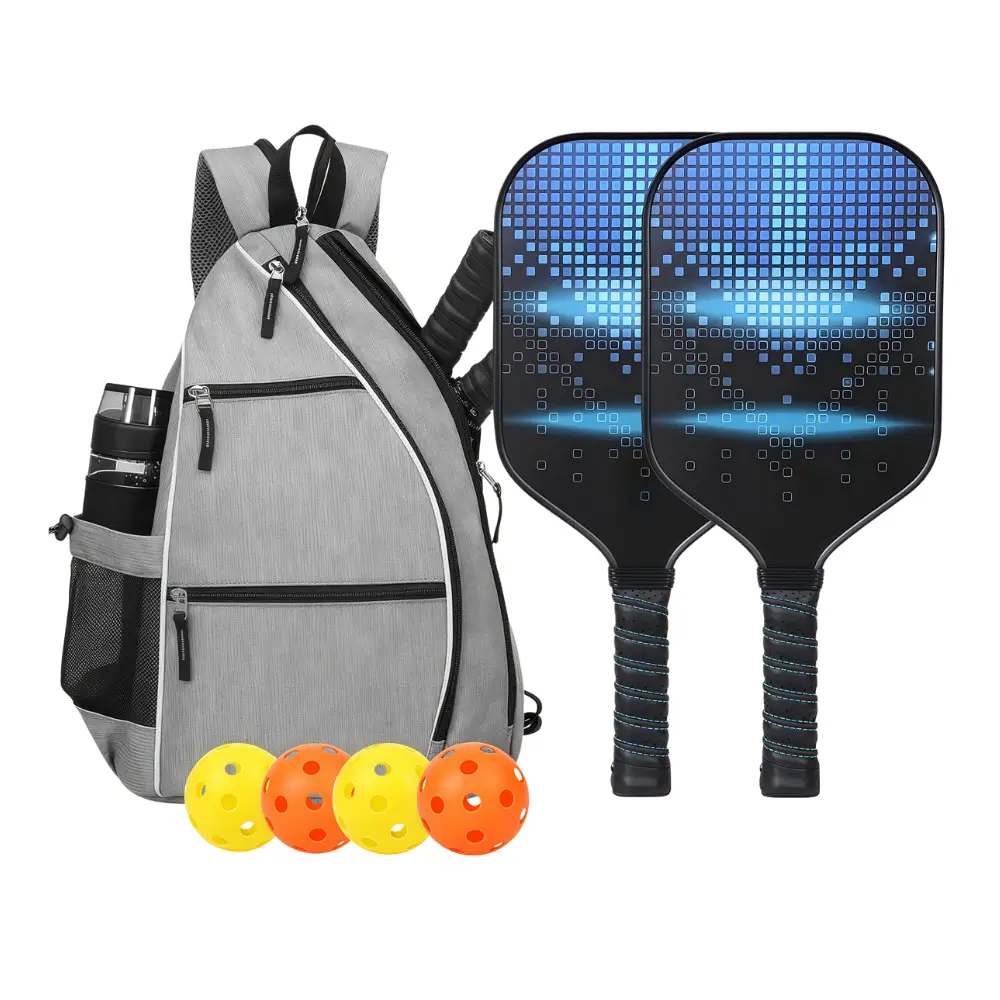 A complete glass fiber pickle ball 2-player set featuring two adult-sized rackets with full-edge UV printing, indoor and outdoor TPE balls, and a durable 600D backpack. Perfect for serious recreational players, travel, and comprehensive promotional packages with customizable printing options.