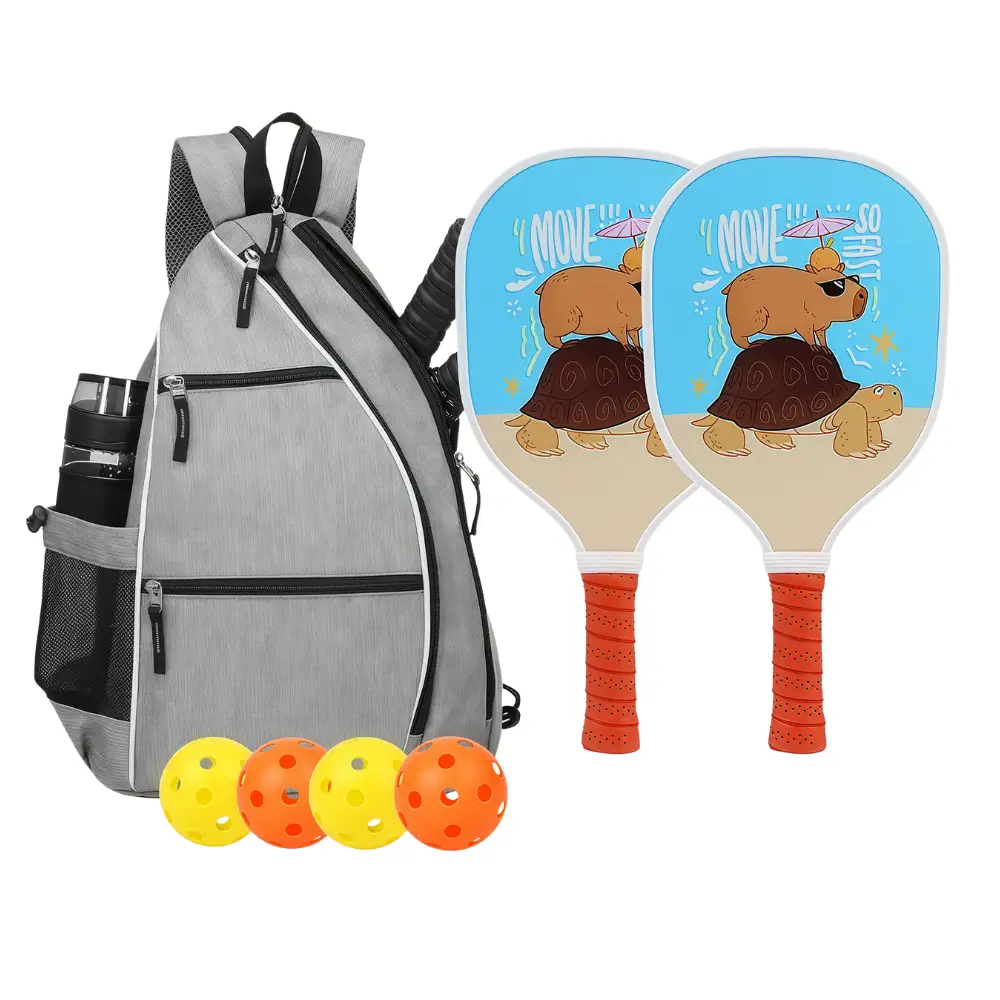 A complete wooden pickle ball 2-player set featuring two adult-sized rackets with full-edge UV printing, indoor and outdoor TPE balls, and a durable 600D backpack. Perfect for recreational players, schools, and comprehensive promotional packages with customizable printing options.