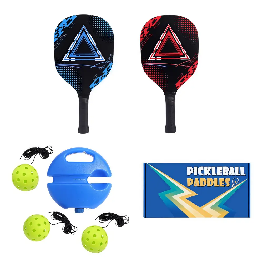 A complete wooden pickle ball training set featuring two adult-sized rackets with full-edge UV printing, three practice balls with elastic ropes, and a pickleball rebound trainer in a colorful box. Perfect for solo practice, skill development, and comprehensive training packages with customizable printing options.