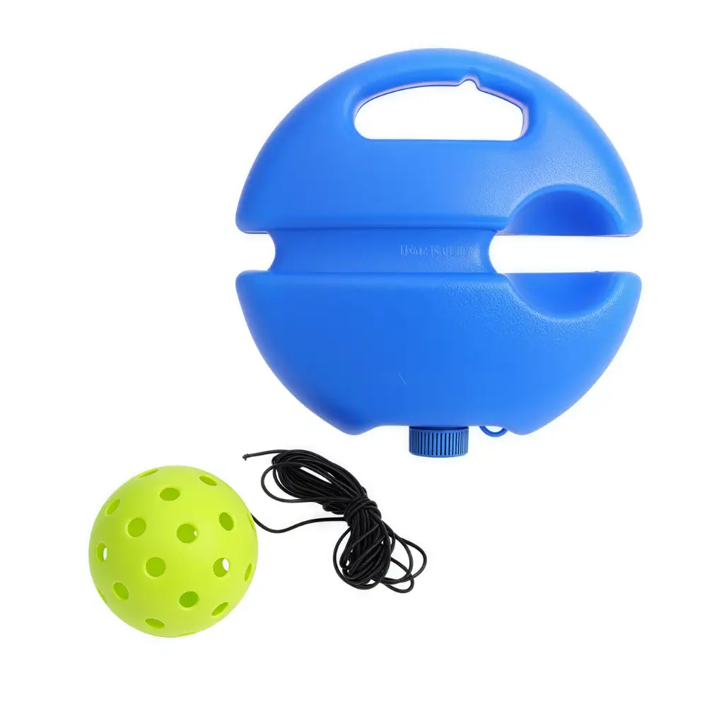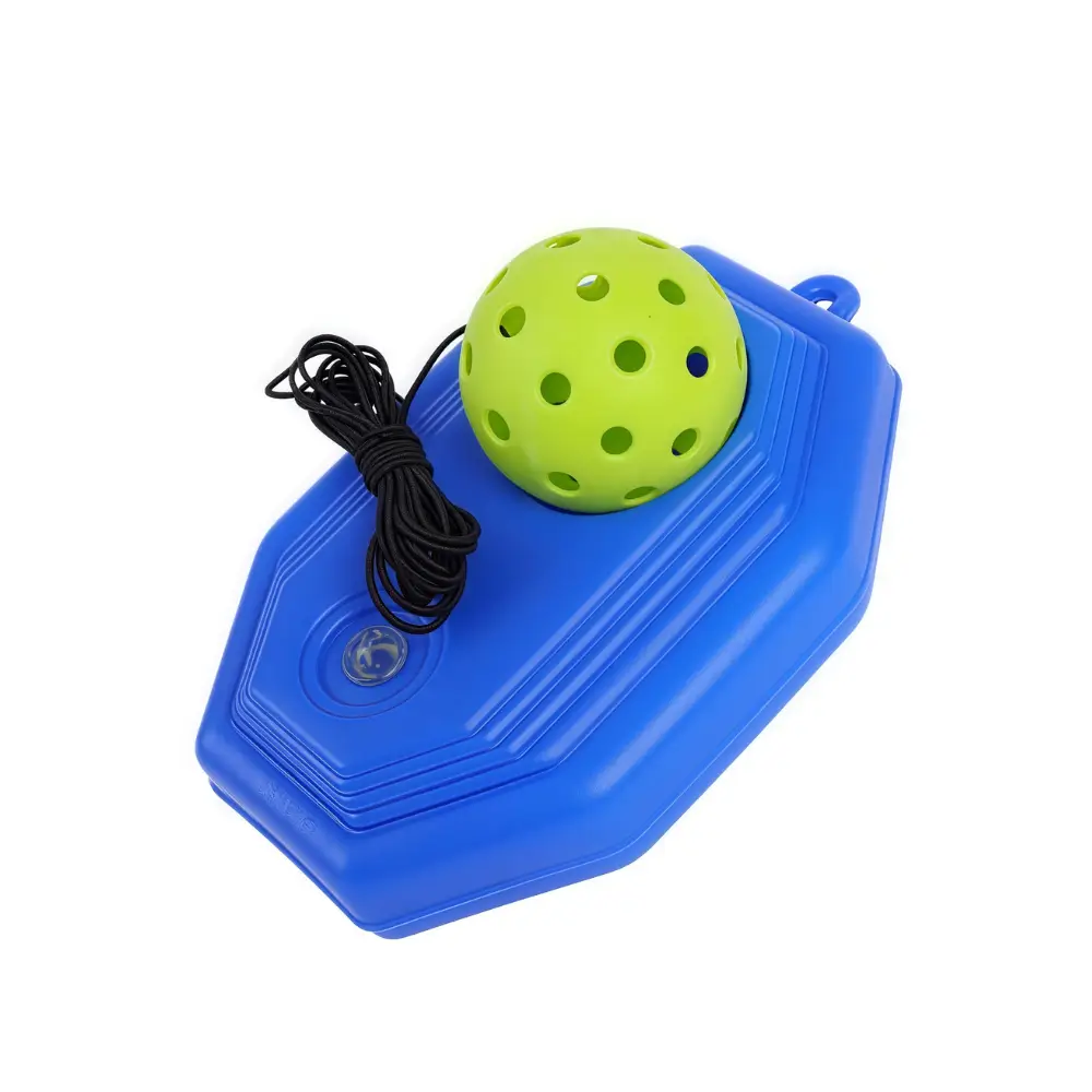 A compact and portable pickleball rebound trainer featuring a plastic pedestal, one practice ball, and an elastic rope. Perfect for solo practice, skill development, and training programs with customizable screen printing options.