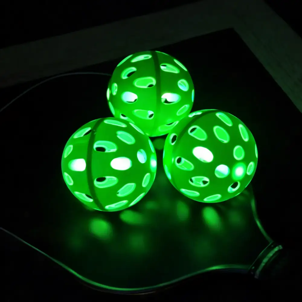 An LED luminous pickleball that lights up for night play. Each ball includes batteries with a remarkable 12-hour battery life for uninterrupted gameplay. Start playing instantly right out of the package with 1 color, 1 position logo customization available.