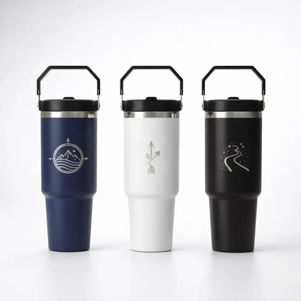 A premium 30oz stainless steel vacuum bottle with ergonomic handle, featuring food-grade inside 304 and durable outside 201 stainless steel construction. Perfect for outdoor adventures, sporting events, corporate gifts, and promotional giveaways with customizable laser or UV printing options.