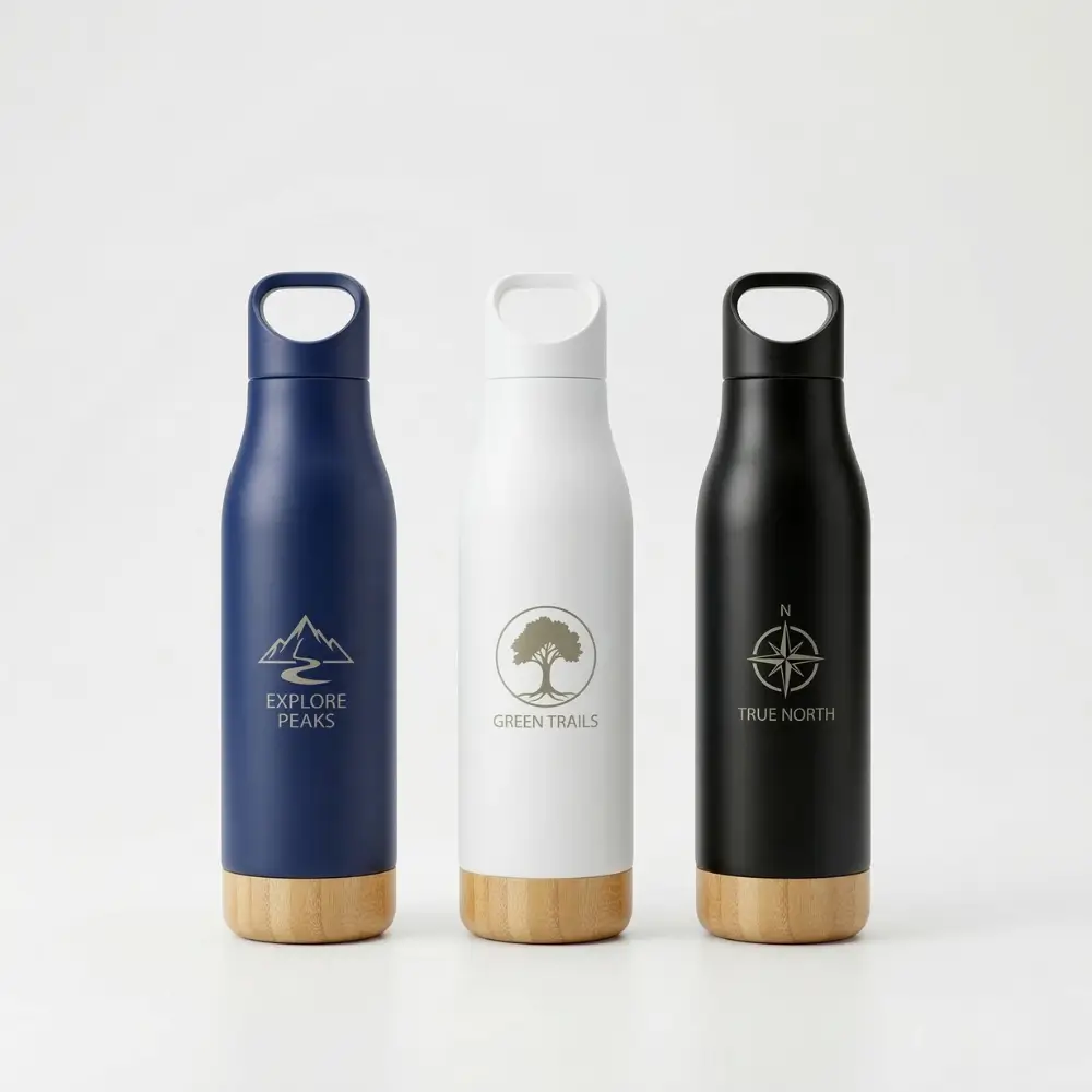 A premium 17oz stainless steel water bottle featuring a modern matte finish, natural wood base, and handle lid. Perfect for corporate gifts, eco branding, and outdoor lifestyle promotions.