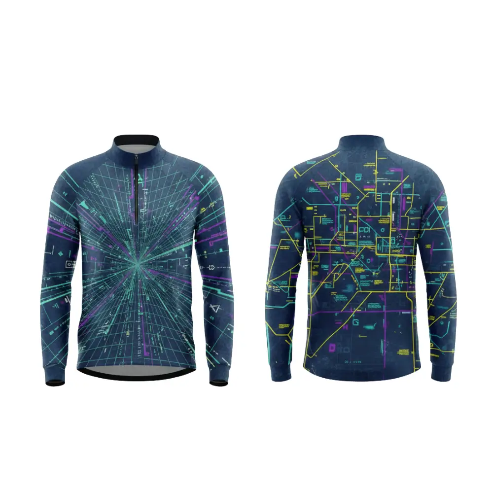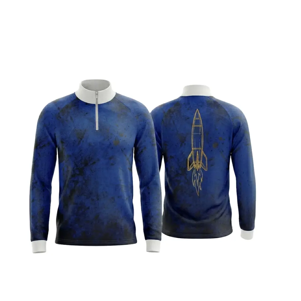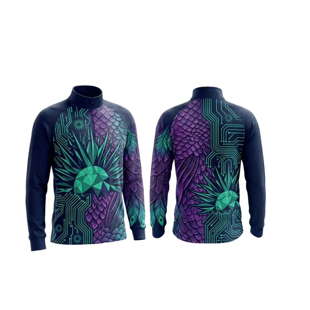 A high-performance quarter zip pullover featuring vibrant, all-over sublimation printing on 150gsm pinhole mesh. The quarter-length zipper offers adjustable ventilation, making it perfect for warm-ups, cool-downs, and variable weather training.