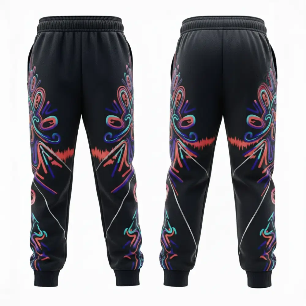 Comfortable and lightweight sweatpants suitable for both unisex and kids, crafted from 250gsm hoodie fabric with looped pile (96% polyester + 4% spandex). Features an elastic waistband with drawcord, two side pockets, and your choice of white or black rope. Perfect for sports, casual wear, or team uniforms with vibrant edge-to-edge sublimation printing.