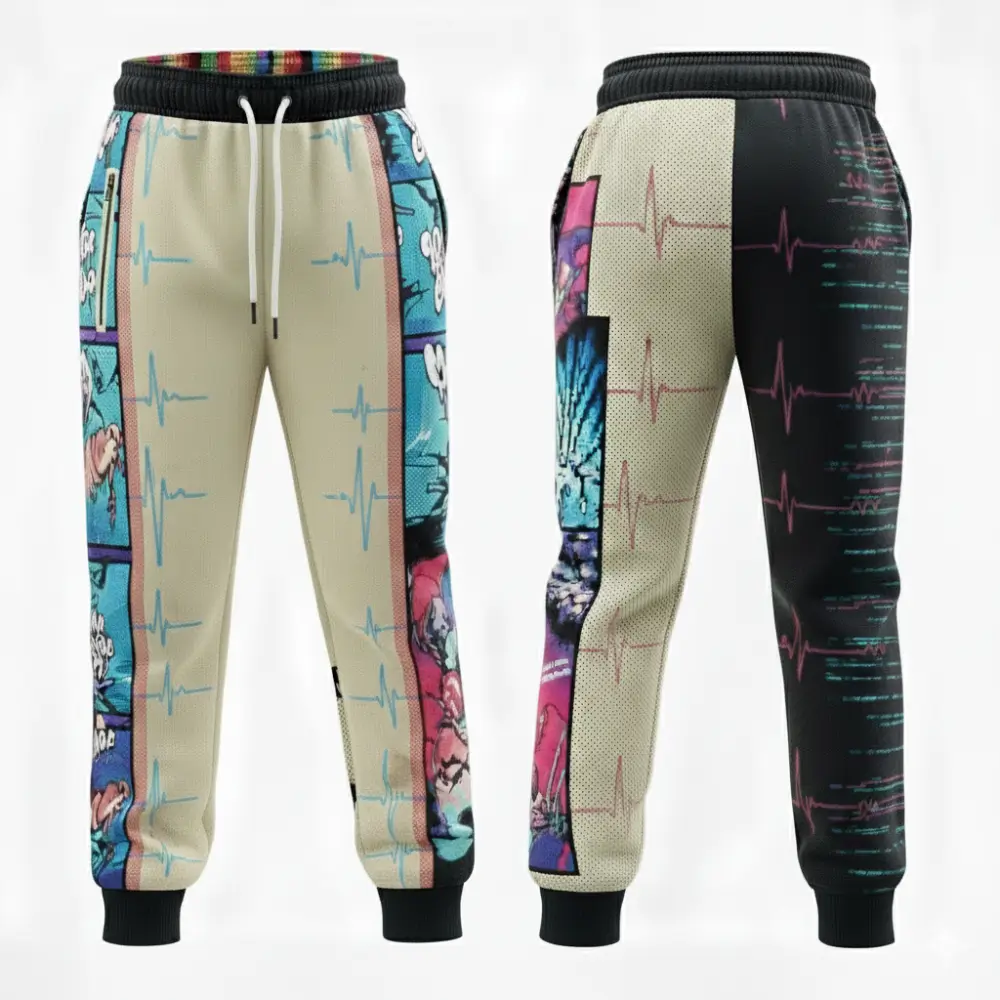 Warm and comfortable fleece-lined sweatpants suitable for both unisex and kids, crafted from 310gsm interlock fabric with fleece lining (95% polyester + 5% spandex). Features an elastic waistband with drawcord, two side pockets, your choice of white or black rope, and vibrant edge-to-edge sublimation printing.